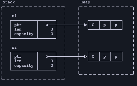 • 来自的堆数据 s1 被复制并 s2 获得自己的独立副本。